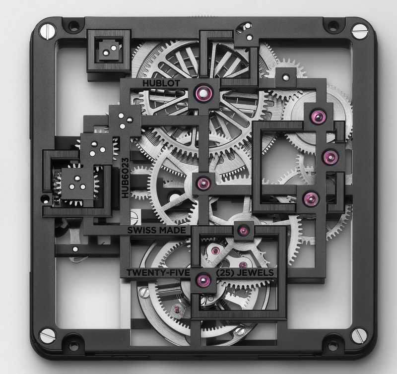 為達成這項全新突破,宇舶專為此錶研發 MHUB6023 手動上鍊鏤空陀飛輪機芯,由 174 枚零件與 25 顆寶石軸承組成,運行頻率為 3Hz(21,600 次/小時),提供長達96 小時(4 日)的穩定動力。機芯橋板全數採用方形與長方形幾何設計,並以霧面與緞面交錯修飾,令層次分明的結構與剛勁線條更加鮮明。核心配置包括: