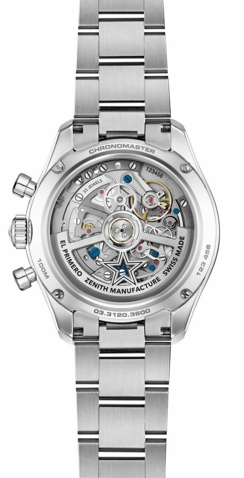 此款腕錶搭載ZENITH真力時最新一代傳奇計時機芯—El Primero 3600機芯。其機芯以5赫茲(36,000次/小時)振頻運作,配備矽質擒縱輪,令計時指針能每10秒旋轉一圈,計時可精確至十分之一秒。60小時動力儲存和停秒裝置,確保了腕錶的穩定性與精準度。透明藍寶石錶背呈現機芯的精巧構造,包括藍色導柱輪、水平離合器和飾有ZENITH真力時星形的鏤空擺陀。