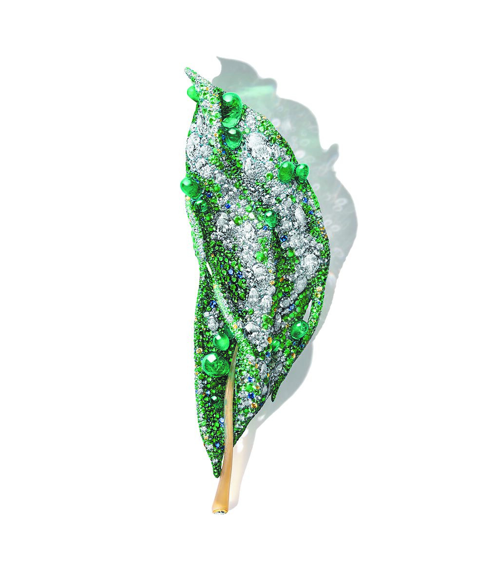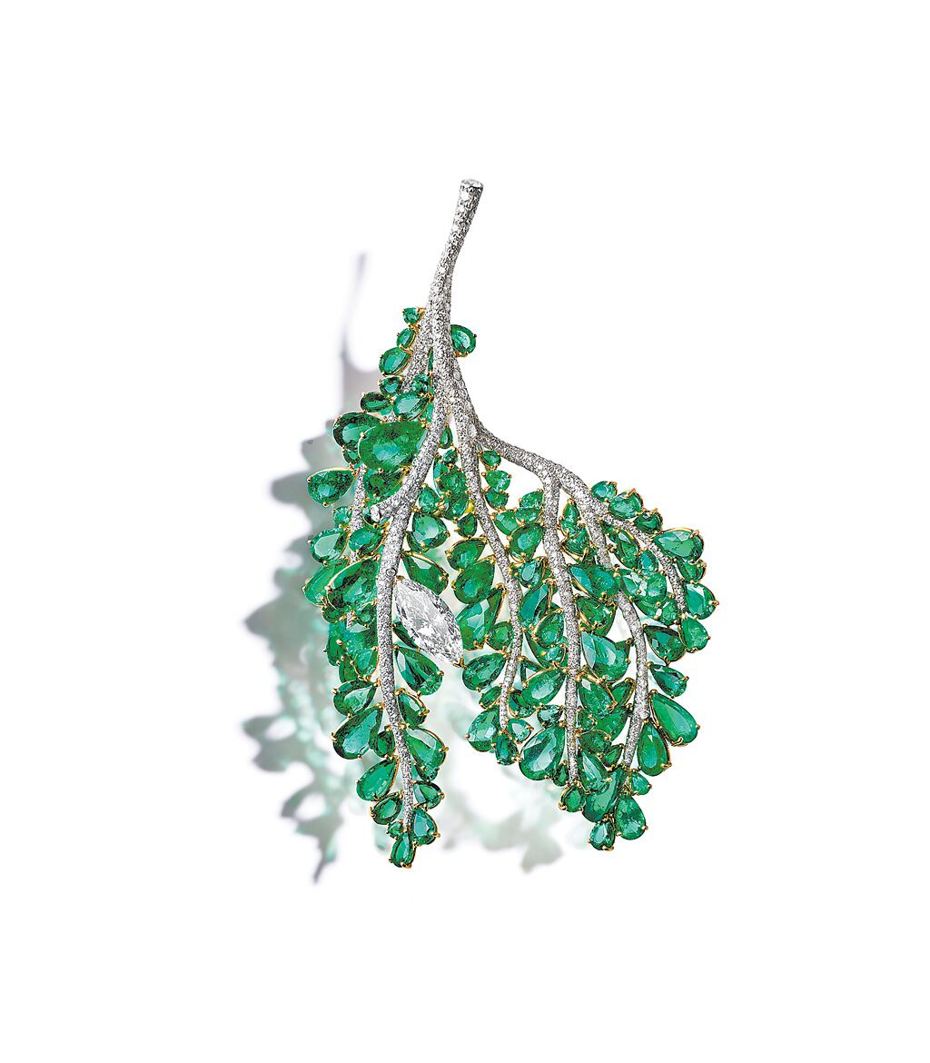 大師系列〈落地生根胸針〉,葉上一顆顆祖母綠圓珠可擺動,象徵萌芽新生。(CINDY CHAO提供)