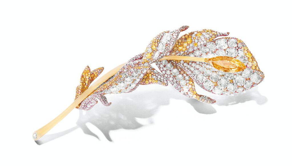 二十周年系列〈黃鑽羽毛胸針〉,漸變色彩有印象派大師莫內的風格,主石為3克拉黃鑽。(CINDY CHAO提供)