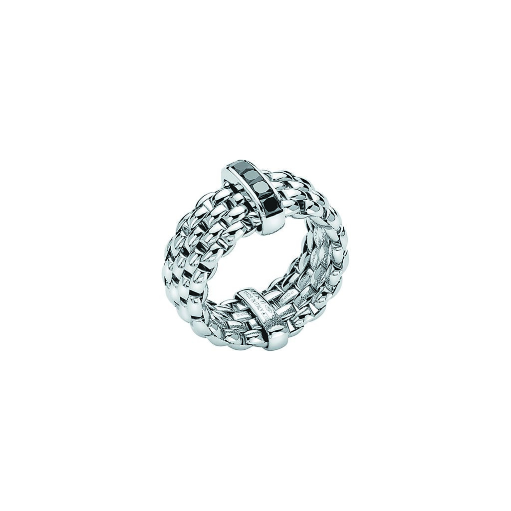 義大利FOPE可伸縮彈性白金寬版鑲0.7克拉黑鑽戒指,13萬5000元起。(瑞博品提供)