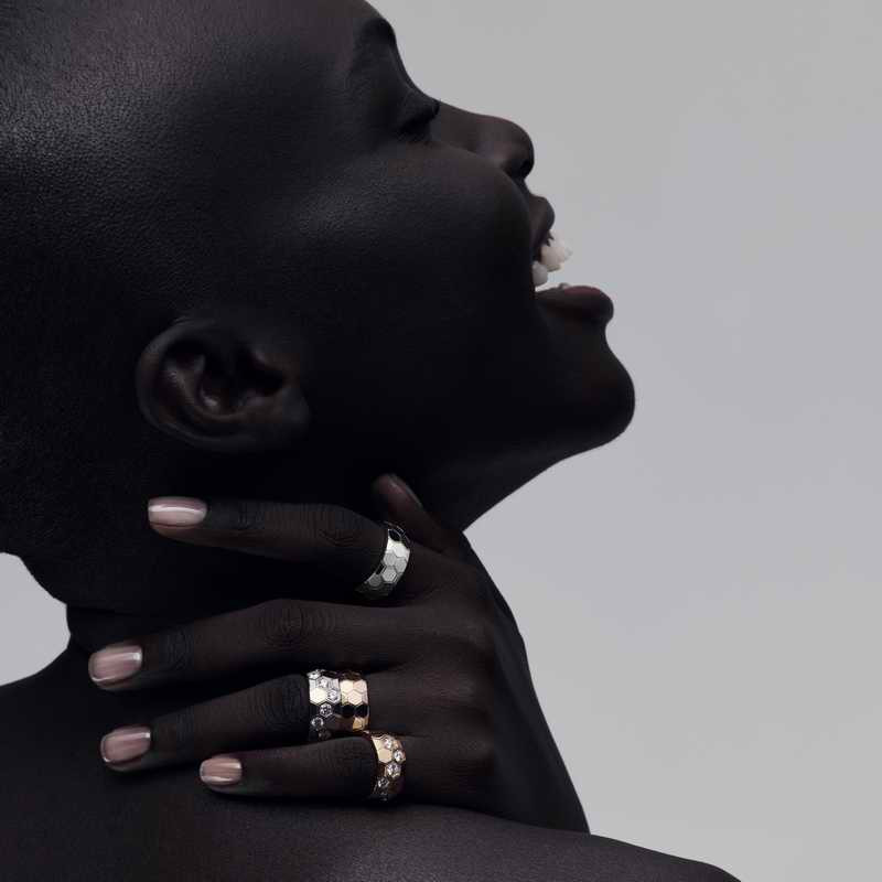 Bee de Chaumet 系列珠寶皆運用「鏡面拋光」金屬工藝,金屬躍然成為主角,即使未鑲嵌鑽石,依然能在光線映照下,折射出耀眼光彩。以蜂巢為靈感的獨特六角形造型,經精密打造的每個切面及角度皆極致俐落,確保光線無論自何方映照,皆能360度全方位捕捉、折射,讓迷人光采隨佩戴者舉手投足間,傾瀉而出。