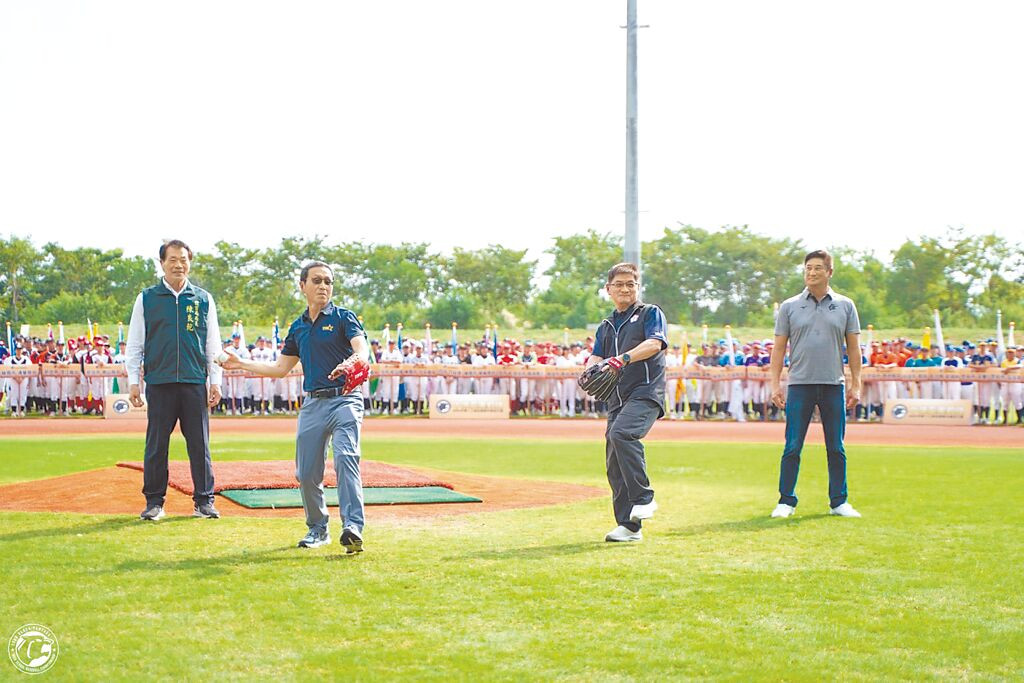 在中華棒協理事長辜仲諒(右一)及臺南市體育局局長陳良乾(左一)見證下,運動部次長洪志昌(右二)及中信銀行董事長陳佳文(左二)為賽事開出好球。(中華棒協提供)