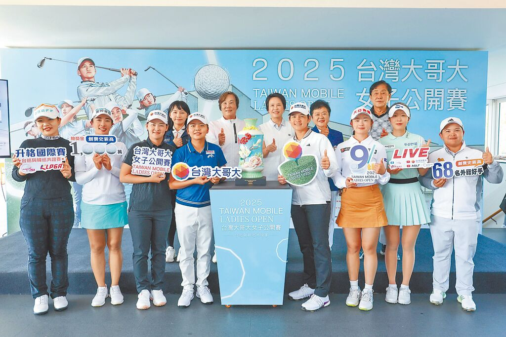 今年「台灣大哥大女子公開賽」與韓國女子職業高球巡迴賽(KLPGA)完成共同認證。前排左起韓國選手黃雅琳、姚宣榆、李旻、徐薇淩、曾雅妮、洪玉霖、韓國選手柳孝周與泰國選手帕查拉朱達;後排左起台豐高爾夫球場副總經理謝袖盈、TLPGA理事長劉依貞、台灣大企業服務事業商務長朱曉幸、KLPGA副理事長金美會、亞洲高爾夫領袖論壇(AGLF)理事長金正泰。(台灣大提供)
