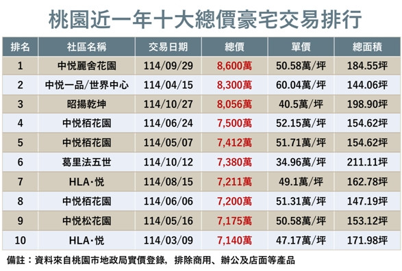 觀察2025年至今桃園十大總價豪宅排行榜,數據精確反映高端客層對「品牌」與「規格」的品牌忠誠度,榜單首位由「中悦麗舍花園」以8600萬元奪冠,緊隨其後的「中悦一品」更以每坪60.04萬元立下成屋豪宅單價天花板,從前十大榜單分析,中悦建設機構的作品即佔據過半席次,顯見在市場產品普遍縮減坪數的趨勢下,具備品牌口碑且堅守百坪豪奢格局的作品,仍是高端買方心中真正好住,且具備傳承價值的核心資產。