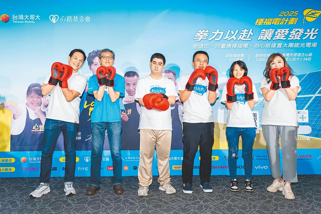 台灣大「2025種福電」計畫以「Love Punch 拳力以赴,讓愛發光」為主題舉辦記者會,左起為台灣大總經理林之晨、心路基金會執行長賴炳良、心路基金會3名庇護員工、台灣大基金會執行長劉麗惠。(石智中攝)