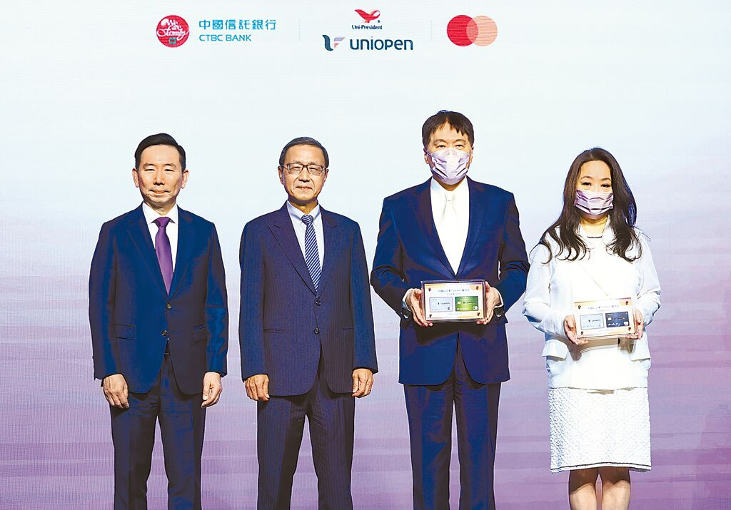 中國信託銀行董事長陳佳文(左二)、總經理楊銘祥(左一)與統一集團董事長羅智先(右二)、美麗事業董事長高秀玲(右一)21日宣布攜手推出「中國信託uniopen聯名卡」,整合30品牌場域打造最大零售金融生態圈。(鄧博仁攝)