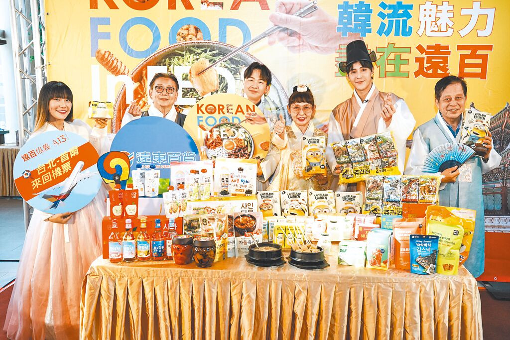 「2025韓流魅力盡在遠百」韓國物產展開跑,遠東百貨徐雪芳總經理(右三)、林彰豊副總(右一)、陳佑任副總(左二)、韓國代表部經濟文化組金優赫科長(左三),向大家推薦優質韓國商品。(遠百提供)