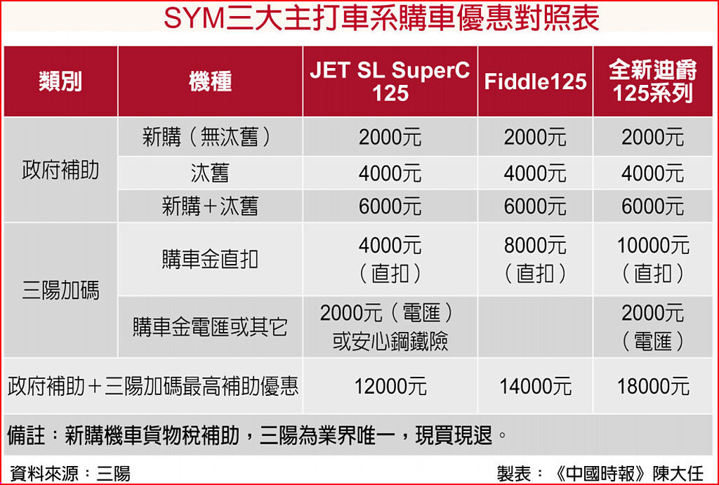 三陽表示,SYM品牌旗下包括JET SL SuperC 125、JET SR、CLBCU、全新迪爵125系列、迪爵125系列、KRNBT、4mica 125/4mica 150系列、Z1 Attila 125、Fiddle 125、Fiddle LT、野狼傳奇125、野狼125、活力125碟煞、活力125鼓煞、WOO 115均為適用新購150cc以下機車減徵貨物稅補助機種,官網也提供清楚的商品資訊。