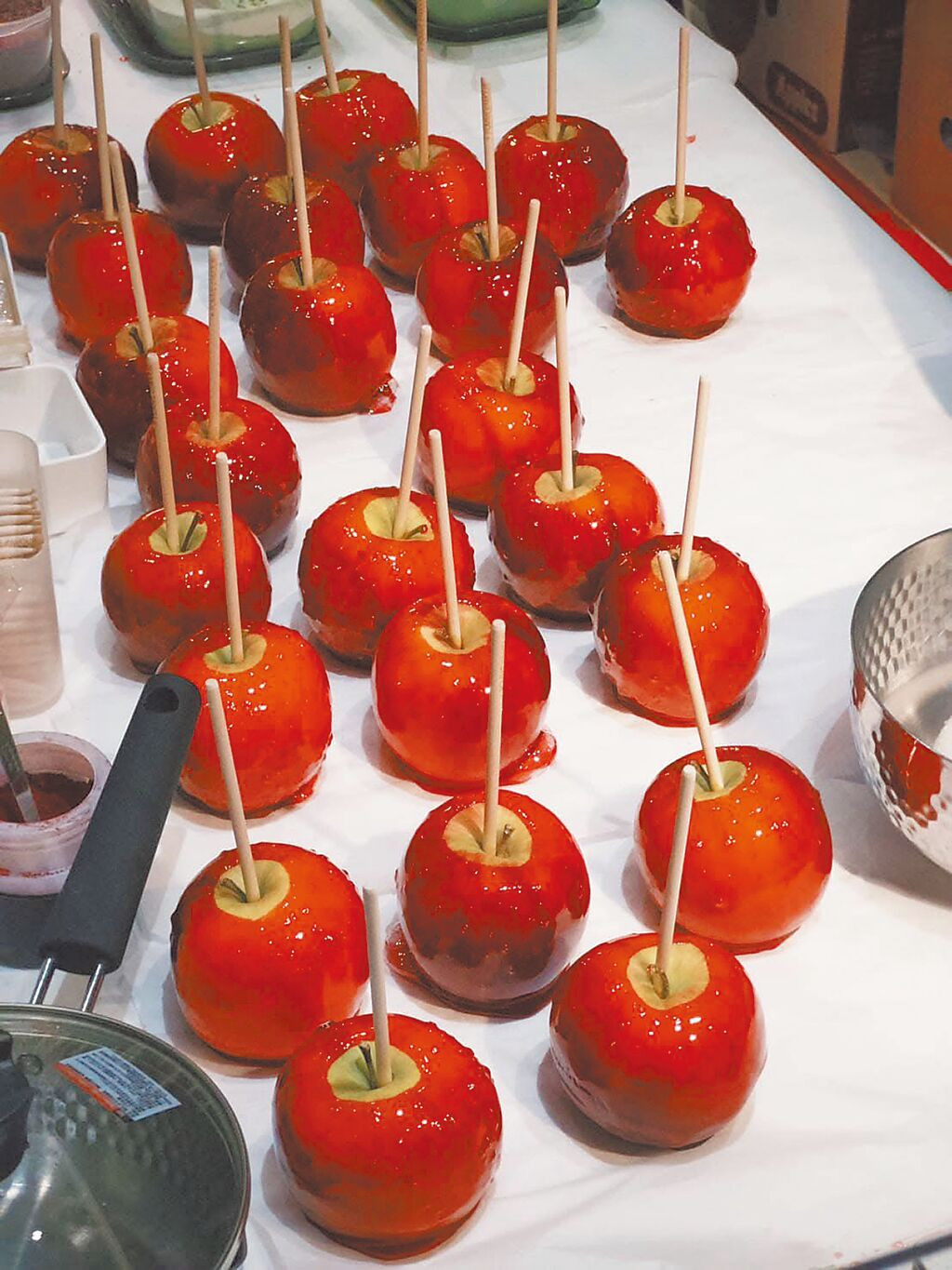 台北信義新天地日本展蘋果糖共推11種口味,排隊超過40分鐘、單日狂銷破千顆。(新光三越提供)
