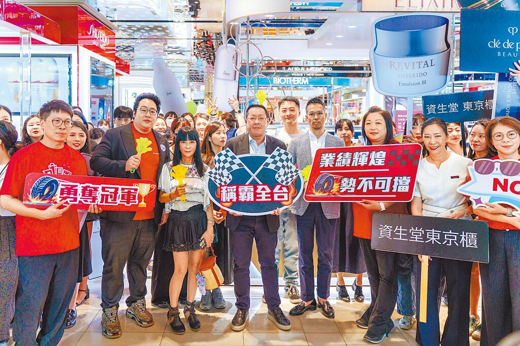 新光三越執行副總吳昕昌(前排左四)為信義新天地周年慶造勢。(吳松翰攝)