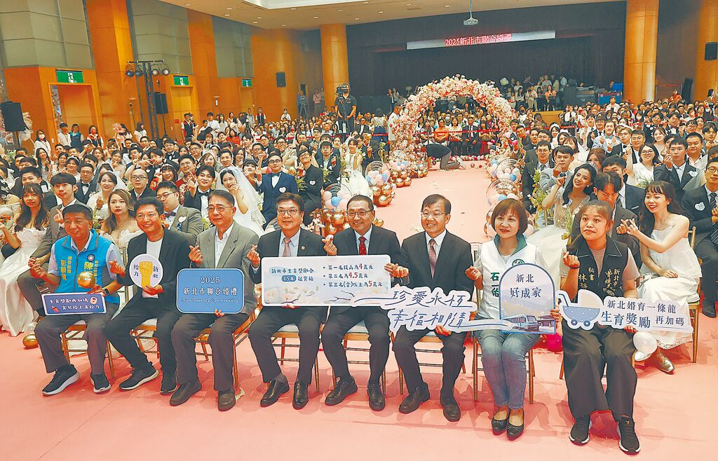 2025新北市聯合婚禮19日於新北市政府浪漫登場,102對新人在市長侯友宜、副市長劉和然的見證下,互許終身、交換誓言,齊聲喊出「我願意」,現場洋溢著滿滿幸福與祝福,溫馨氣氛瀰漫整個會場。