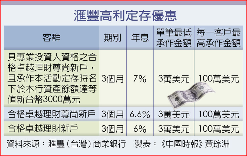 滙豐為合格的私人銀行客戶與卓越理財尊尚客戶,提供3個月新台幣定存年息3%優惠;單筆最低承作金額皆為新台幣300萬元,每一客戶最高承作金額為新台幣3000萬元。滙豐也積極搶進金字塔財富管理市場,推出領先市場的超優定存利率,力求吸引更多潛在市場資金,持續擴大財富管理市占率。