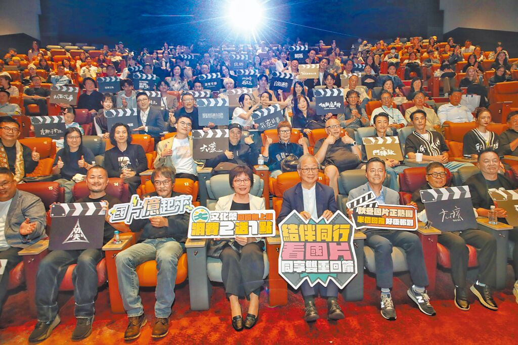 2025國片億起來記者會,文化部長李遠(前排右四)及上百電影人一同出席。(王英豪攝)