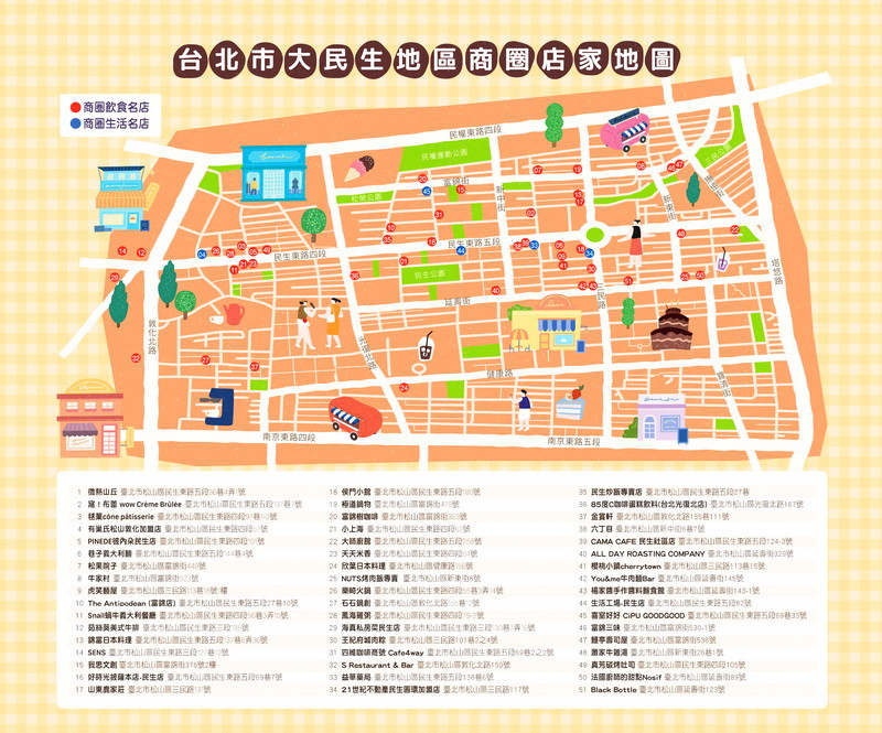 民生商圈邀請大家帶著民生好店地圖,來商圈邂逅民生社區的美好,享受城市綠洲的悠活靜謐,帶動整體大民生地區商圈的活絡。相關活動資訊請鎖定「台北市大民生地區商業發展促進會」FB粉絲團(https://reurl.cc/kaXdj3)或「台北市商業處-我是商Ya人」FB粉絲團(http://www.facebook.com/tcooc/)查詢。