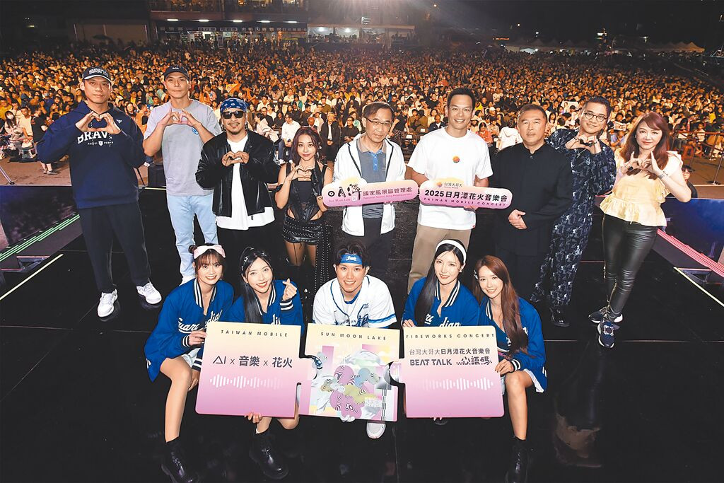 「2025台灣大哥大日月潭花火音樂會」結合AI、音樂、花火與公益,引爆3.5萬人參與。後排左起為臺北富邦勇士籃球隊林志傑、蔡文誠、歌手葛西瓦、艾薇、日月潭國家風景區管理處副處長湯維堯、台灣大總經理林之晨、音樂總監江靖波、歌手卓義峯、台灣大永續品牌公關副總經理劉麗惠。前排左起為Fubon Angels 沁沁、潔米、團長崔維斯、南珉貞、禾羽。(台灣大提供)