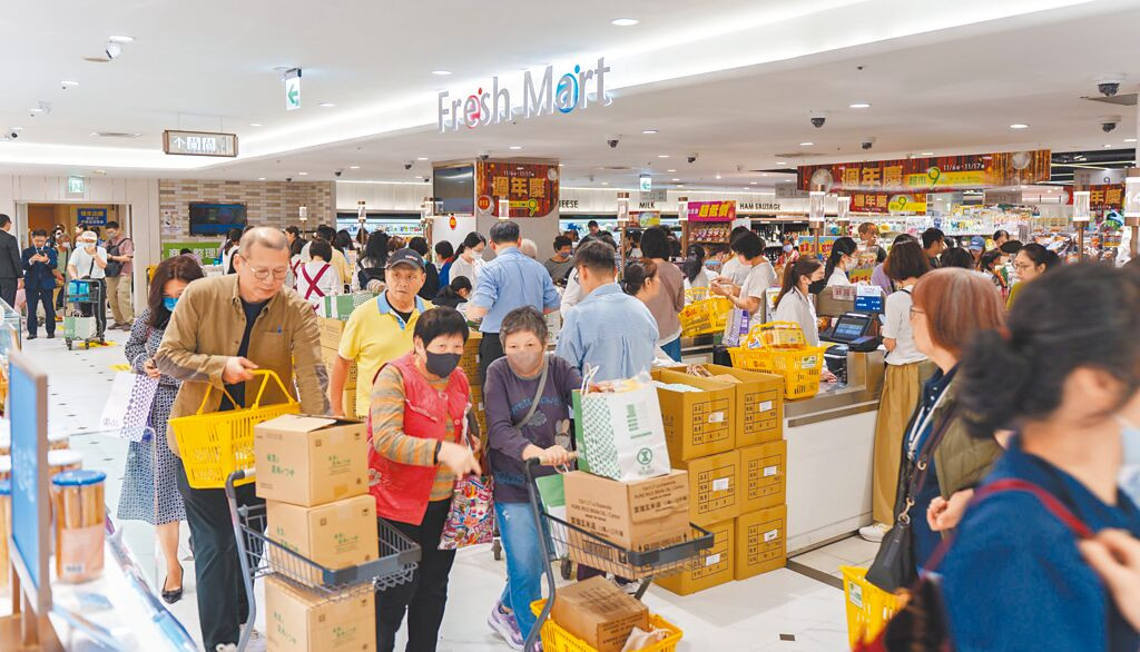 SOGO忠孝館Fresh Mart祭出全面9折,逾百款商品買1送1、超值箱購,昨頭香民眾早上6點就來排隊。(吳松翰攝)