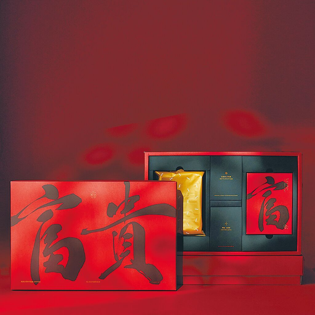由名廚林泉Richie Lin創辦的湘樂餐飲集團旗下打造,年禮內含焙茶蛋捲X2、蘋果米餅X6、紅茶杏仁牛軋糖45g、普洱茶5包,書法家王意淳題字「富貴」招財迎好運,焙茶蛋捲、蘋果米餅、牛軋糖搭配萃釀普洱茶,讓團聚更添喜氣。