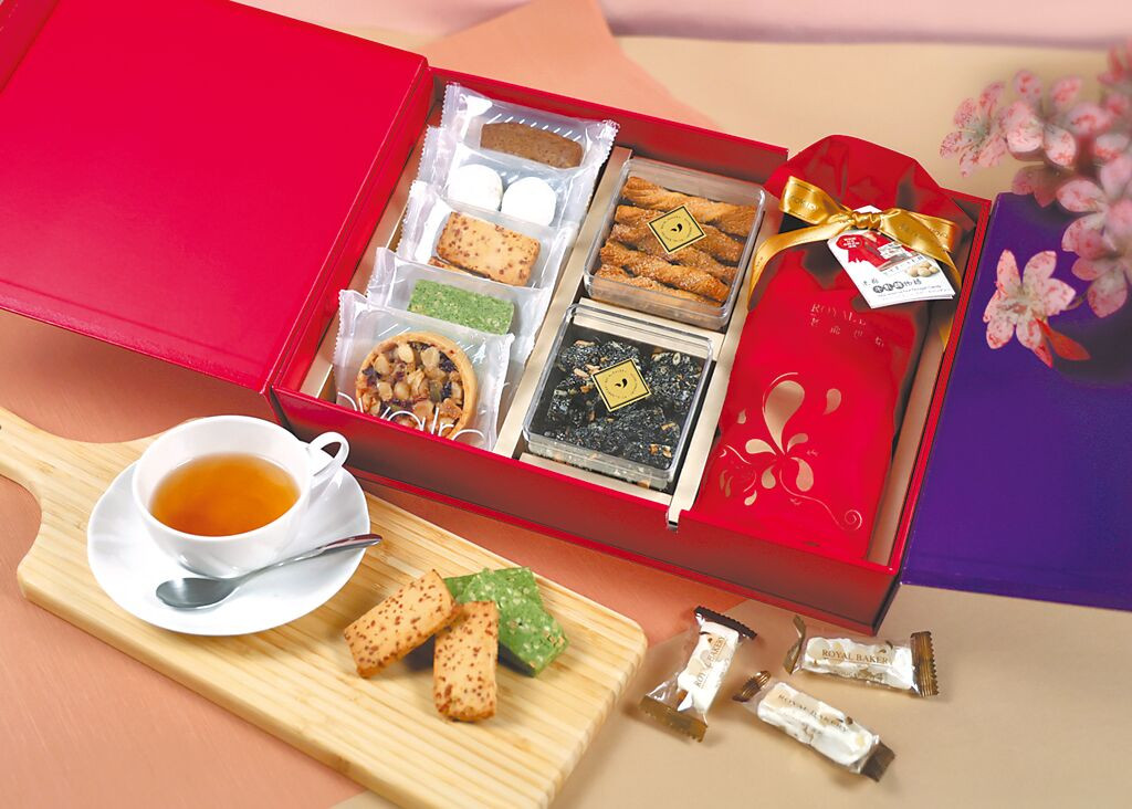 年禮上層有國宴旺來酥6入、南棗核桃糕6入、起士曲奇餅1罐;中層楓糖芝麻核桃5入、南瓜子酥8入、花生牛軋糖8入;下層鴻運富貴糕3入,還有紅包袋6入。
