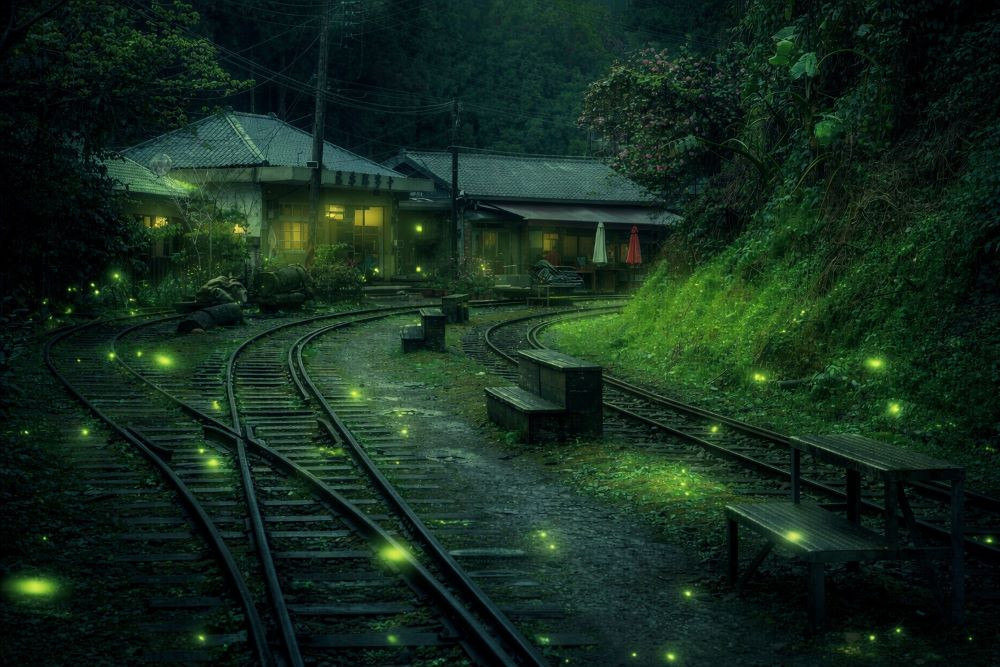 嘉義縣大阿里山區十字車站,4至5月可以欣賞到翩翩起舞的螢火蟲,森鐵與起舞的螢火蟲交織出夢幻螢河的畫面。(圖/阿里山賓館提供)