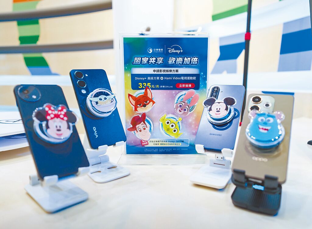 主題門市展示中華電信獨家圖樣的Disney磁吸手機支架。(吳松翰攝)